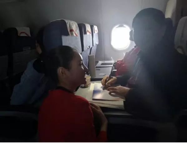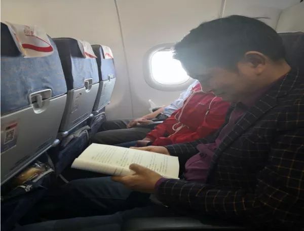 飛機(jī)上,窗外的雪景讓人動(dòng)心。窗內(nèi)的景致也讓人動(dòng)情——曾良策校助、邢斌老師、楊乾海老師、黃俊老師都利用碎片時(shí)間看書。特別讓我們感到神奇的是,飛機(jī)上一位素不相識(shí)的空姐,看到認(rèn)真閱讀的曾校助,居然非常崇拜地蹲下來求他簽字留言,成為曾校助又一個(gè)空姐粉絲。
