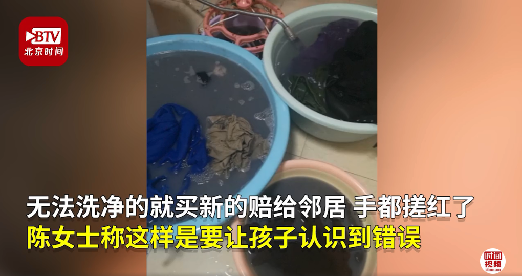 事情發(fā)生后,熊孩子的父母“兵分兩路”迅速補救:孩子媽媽帶著孩子挨家挨戶敲門道歉,并承諾把臟的衣服讓孩子手洗恢復(fù),孩子爸爸請高空作業(yè)的保潔公司幫忙恢復(fù)墻體,要求孩子一直站在太陽底下看著,直到清潔工人清潔完畢,方可離開。