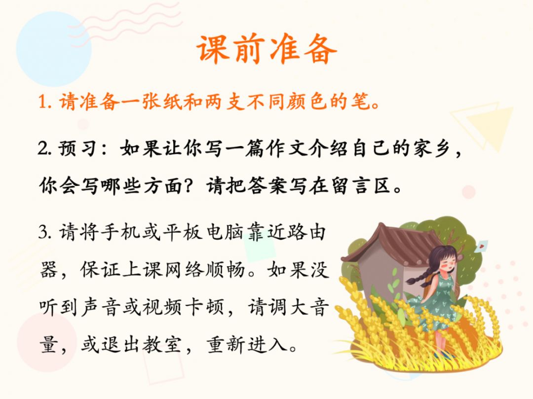 比如說(shuō)這節(jié)課是下午三點(diǎn)開始,在2點(diǎn)50的時(shí)候,您就可以上線了,您可以提前10分鐘做一張PPT,把今天的預(yù)習(xí)內(nèi)容,以及網(wǎng)絡(luò)條件怎樣才能保持通暢的注意事項(xiàng)發(fā)給孩子們。