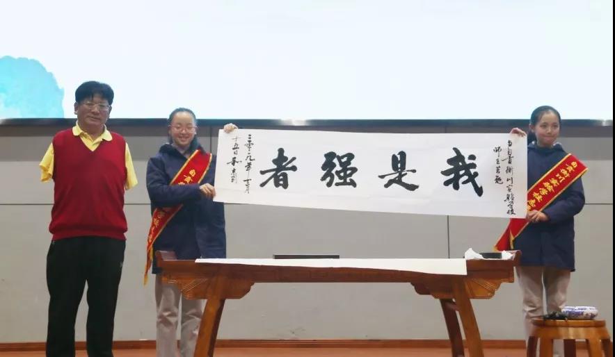 隨后,和老師現(xiàn)場(chǎng)揮毫潑墨,獲得了師生雷鳴般的掌聲。這掌聲是為其遒勁書法,更為其勵(lì)志人生。