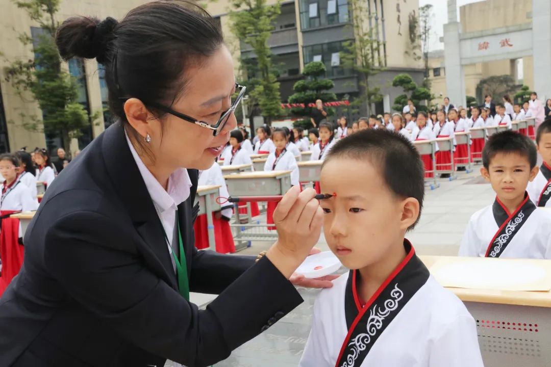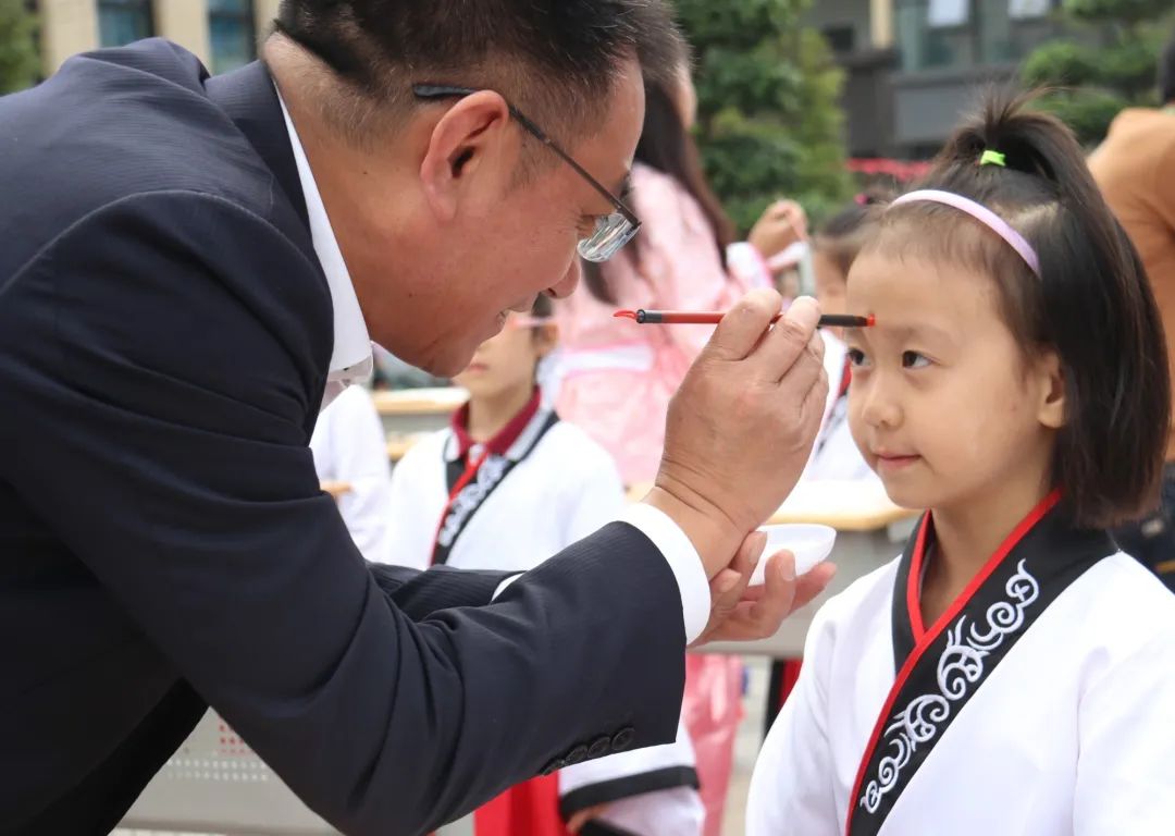 第二項(xiàng)由尹校長(zhǎng)、徐校長(zhǎng)帶領(lǐng)老師們給孩子們“啟智” ,一起將鮮紅的朱砂,在孩子們的額頭正中點(diǎn)痣,為他們開天眼。一顆顆紅痣在額上閃耀,飽含父母、長(zhǎng)輩、學(xué)校的美好祝愿,在孩了們心中勾畫起一道道亮麗的風(fēng)景。