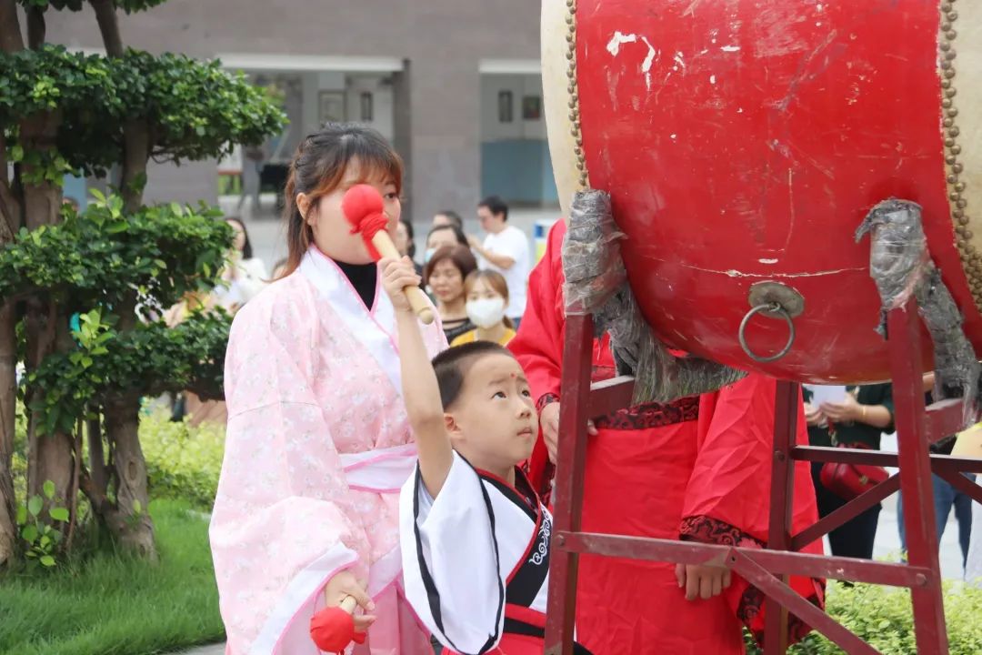 在鏗鏘有力的鼓聲中,“開筆禮”活動(dòng)拉開序幕???,一年級(jí)的小寶們?cè)诶蠋煹膸ьI(lǐng)下,跨過狀元橋,通過欞星門,邁上破蒙受教第一步,預(yù)示今后“平步青云”---步步高,躍龍門——皆成名。