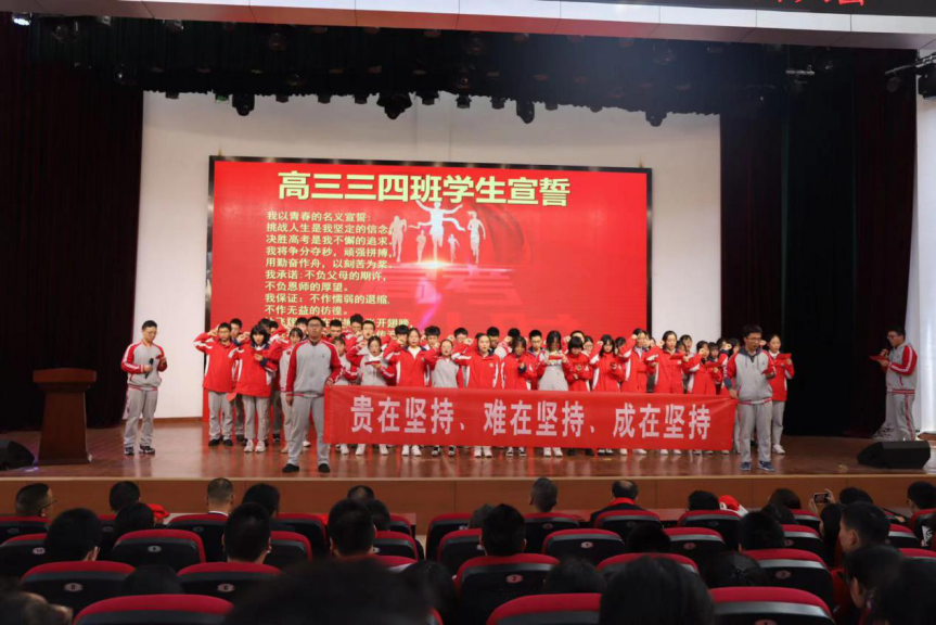 各班學生分別宣誓 高三年級的四個班級逐一上臺,為全體師生展現(xiàn)本班的風采。“同闖崢嶸十春秋,共創(chuàng)輝煌佳年華”“努力造就實力,態(tài)度決定高度”“貴在堅持、難在堅持、成在堅持”,聽啊,這就是高三學子的聲音,更是高三學子面對高考大關的無盡信心。