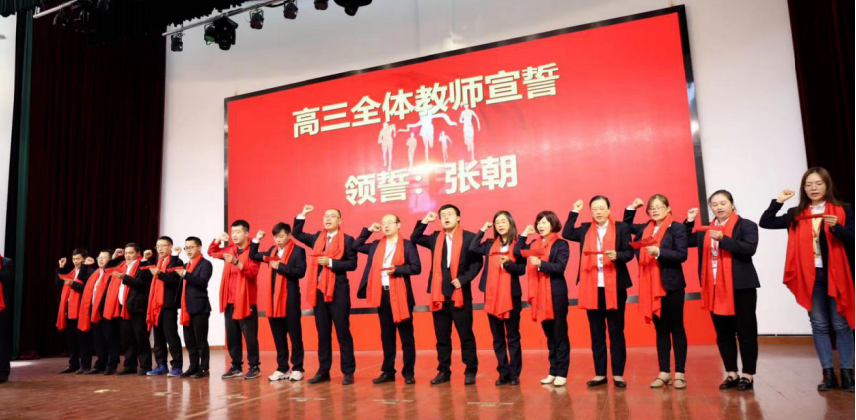 鮮紅的圍巾飄揚,老師們莊嚴宣誓,像軍師一般,為同學們定軍心、昂斗志,讓同學們知道,高考不是我們獨自的戰(zhàn)場,老師們永遠與我們一起戰(zhàn)斗。