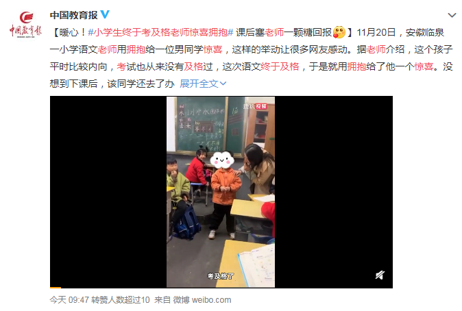近日,安徽臨泉一小學(xué)語文老師用擁抱給一位男同學(xué)驚喜,這樣的舉動(dòng)讓很多網(wǎng)友感動(dòng)。