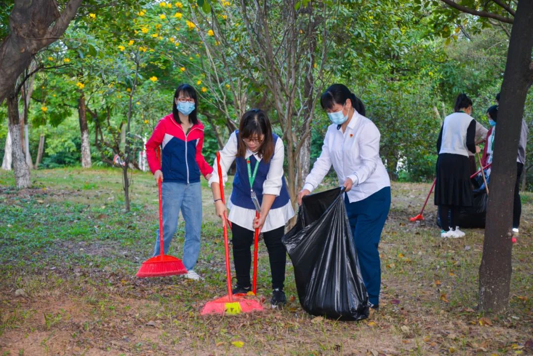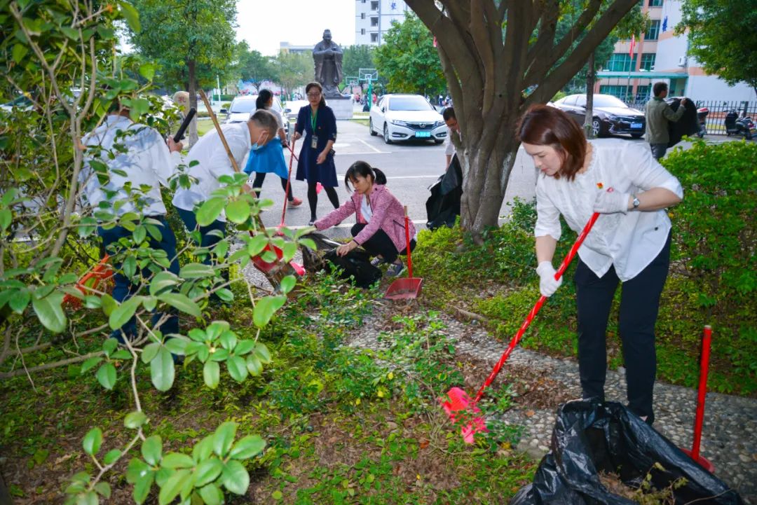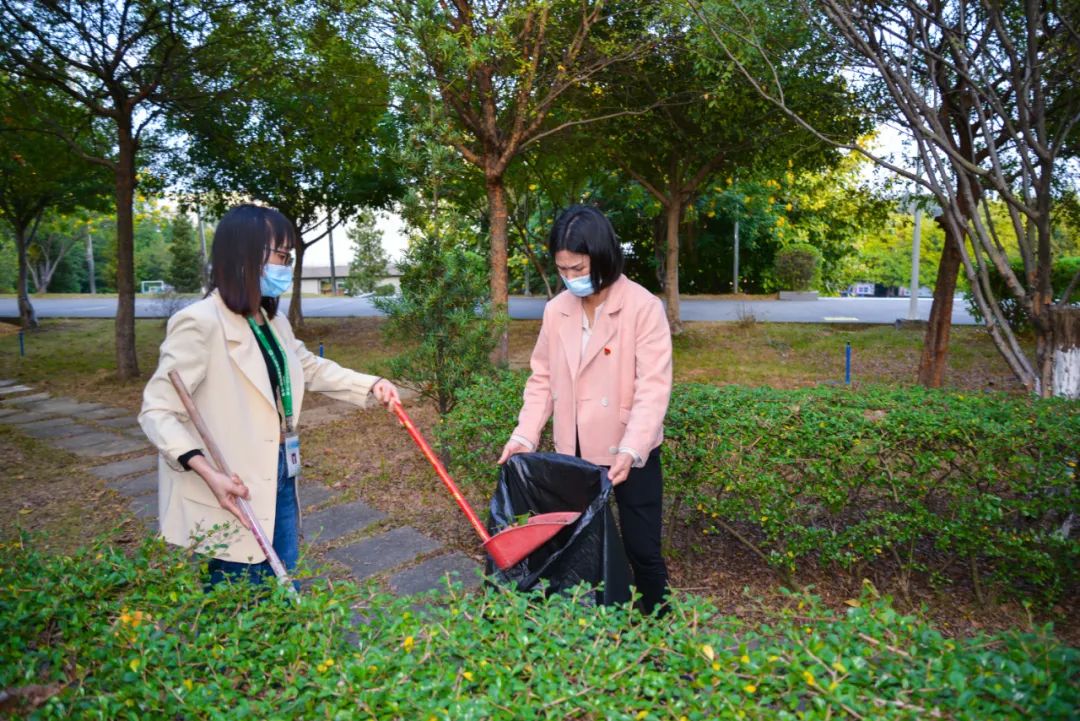 簽約儀式結(jié)束后,兩個黨支部全體黨員分成4個小組,聯(lián)合開展校園衛(wèi)生清潔活動。