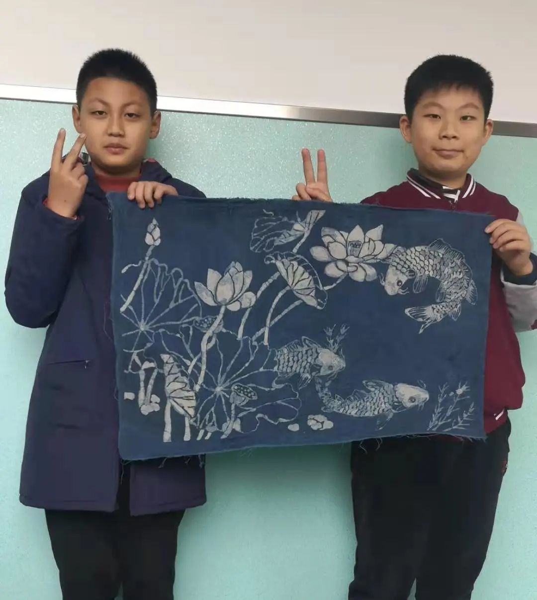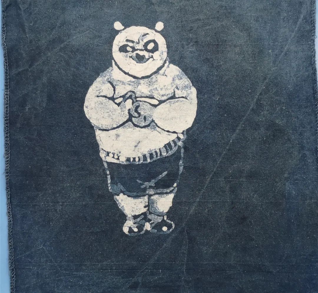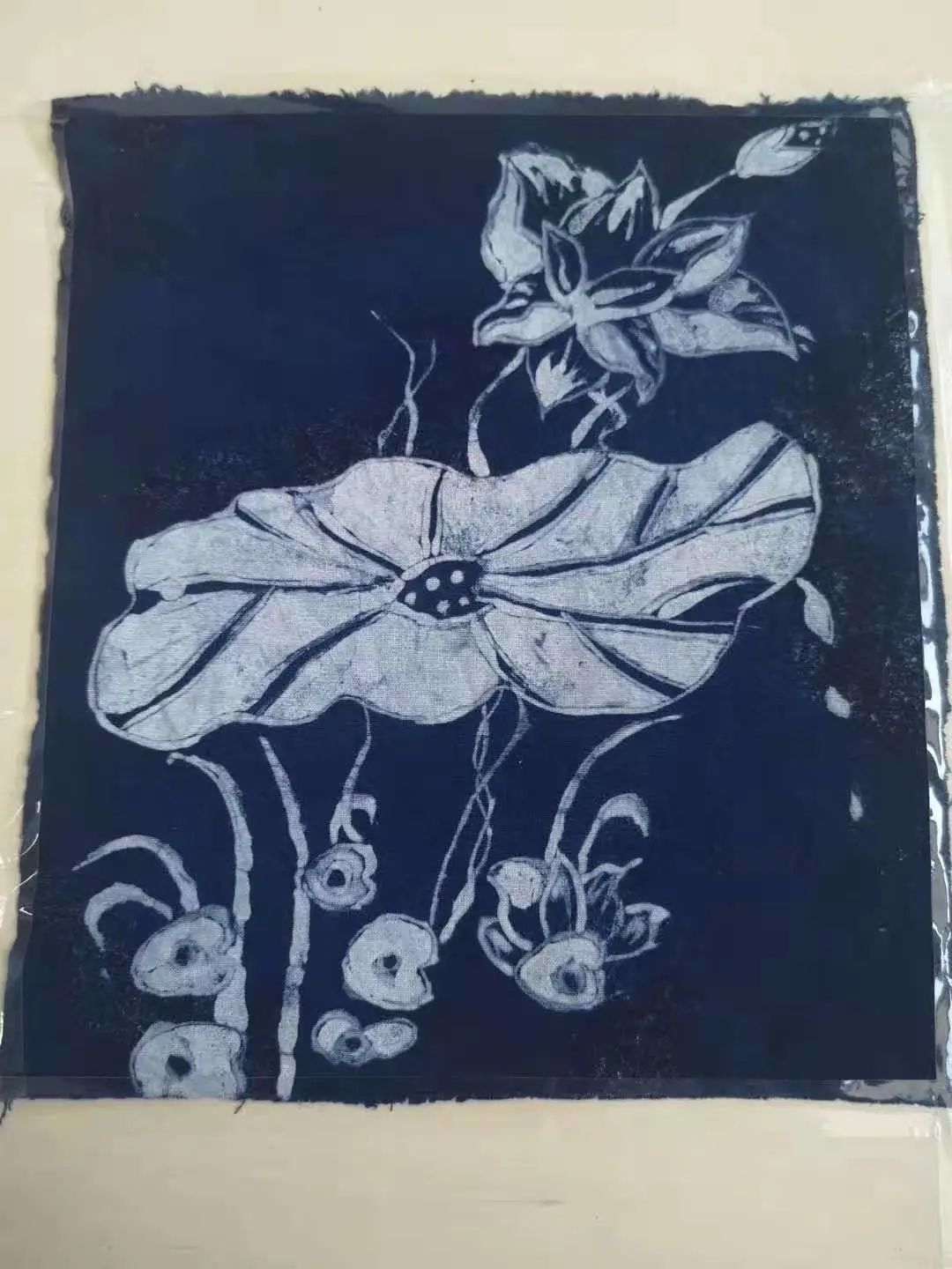 蠟染是用蠟刀蘸熔蠟繪花于布后以藍(lán)靛浸染,既染去蠟,布面就呈現(xiàn)出藍(lán)底白花或白底藍(lán)花的多種圖案。